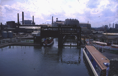 | "Golden Eagle" hired by the Payzants from E.C.C. waits at the canal entrance of the Anderton Lift to enter the lift. |